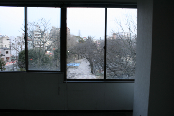 入り口のドアを開けると、一面が窓で外の景色は某公園の桜の木が見える。