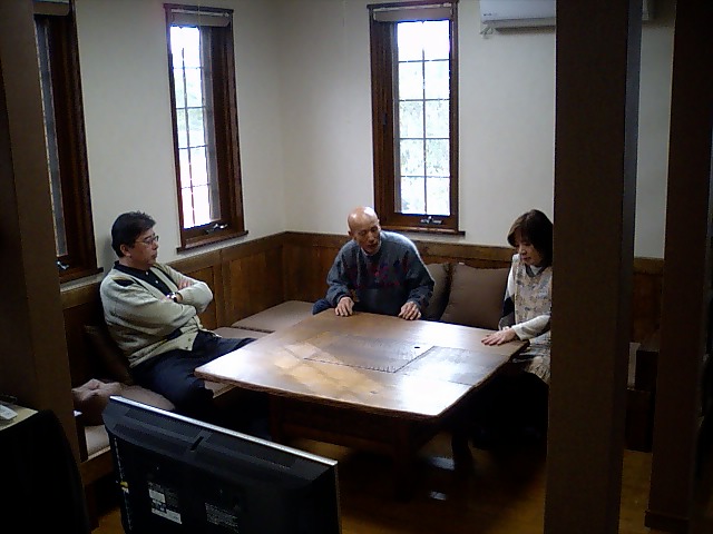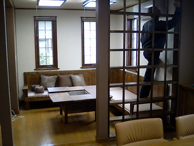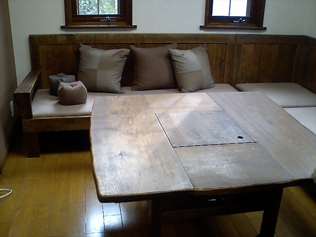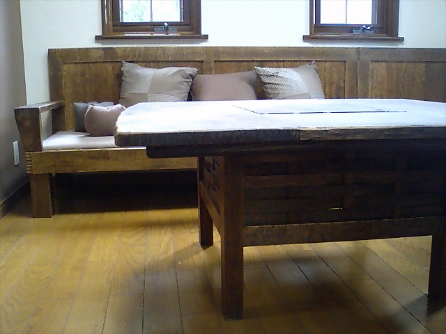 火鉢のテーブルと、それを囲む長椅子、あと部屋を仕切る棚を納品してきました。